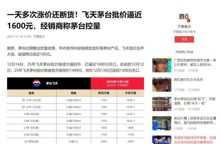 根据北京日报的报道,飞天茅台酒一天内4次上调价格。12月13日,飞天茅台酒(2025年)的价格跳涨了4次,18点左右,拿货价格都达到了1580元/瓶。